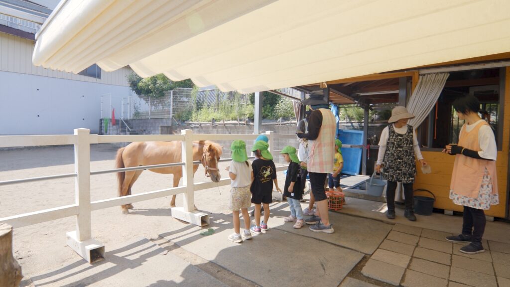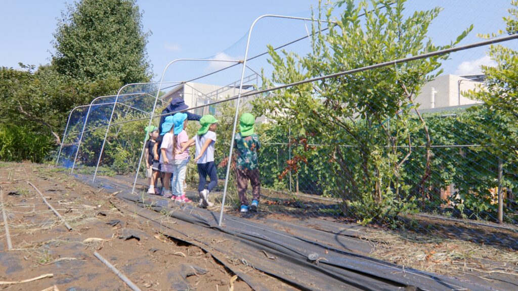 【園庭の隣りには農園があります】上の原農園では子ども達自身が季節のお野菜を栽培・収穫しています。自然の恵みを活かした食育に力を入れているのが上の原保育園の特徴のひとつです。作物は年度ごとに変わりますが、例をあげると… イチゴ狩り、タケノコ掘り、じゃがいも掘り、さつまいも掘り、すいかの採り入れとすいか割り、大根抜き、 なす・すいか・トマト・とうもろこしの苗植えから収穫まで、稲刈り、梅採りと梅ジュース作り、みかん狩り、…を、1年で体験しました。