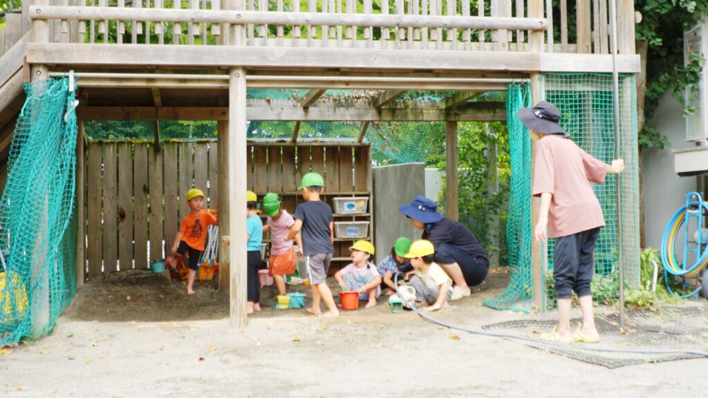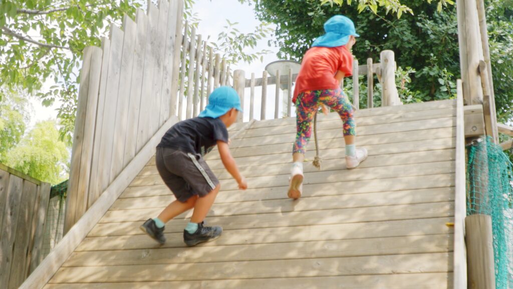 目の前にある園庭は、もともとの土地の高低差を活かした作りになっています。ロープにつかまって斜面を登ったり、木登りしたり、芝生に寝転がったり。木漏れ日の中で遊ぶ子ども達の楽しそうな笑顔に、きっと保護者の方々にも満足していただける事と思います。